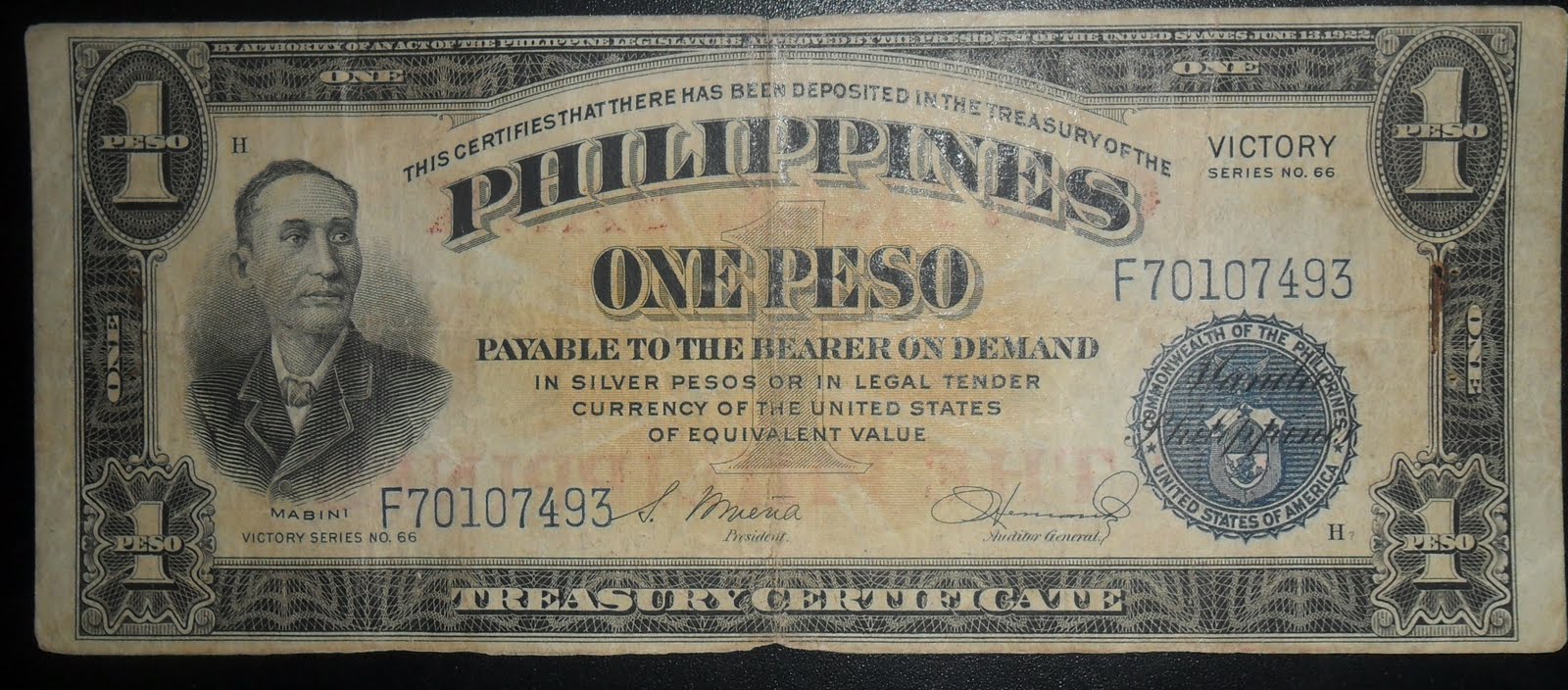 By authority of an act of the Philippine Legislature. Approved by the President of the United States June 13, 1922. This certifies that there has been deposited in the treasury of the Philippines One Peso payable to the bearer on demand; in silver pesos or in legal tender currency of the United States of equivalent value." Victory series no. 66, Treasury Certificate